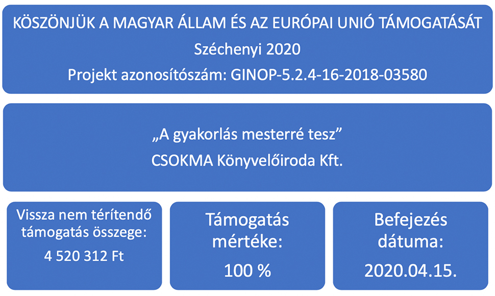A CSOKMA Könyvelőiroda Kft., a Széchenyi 2020 Gazdaságfejlesztési és Innovációs Operatív Program támogatási rendszeréhez benyújtott „A gyakorlás mesterré tesz” című, GINOP-5.2.4-16-2018-03580 jelű pályázatát a Gazdaságfejlesztési Programok Irányító Hatóságának vezetője támogatásra érdemesnek ítélte. A CSOKMA Könyvelőiroda ezáltal 4 520 312 forint vissza nem térítendő támogatást nyert el.